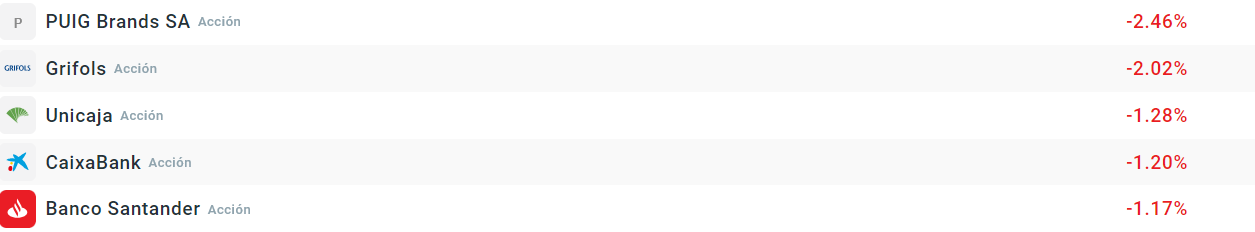 Las caídas vuelven a estar copadas por Puig, aunque en general las caídas se están incrementando a medida que avanza la sesión. Grifols también cae más de un 2% y es que la OPA se podría complicar por las demandas de los inversores minoristas. La banca también cae en lo que podría ser el comienzo de una corrección, debido a las expectativas de bajadas de tipos.