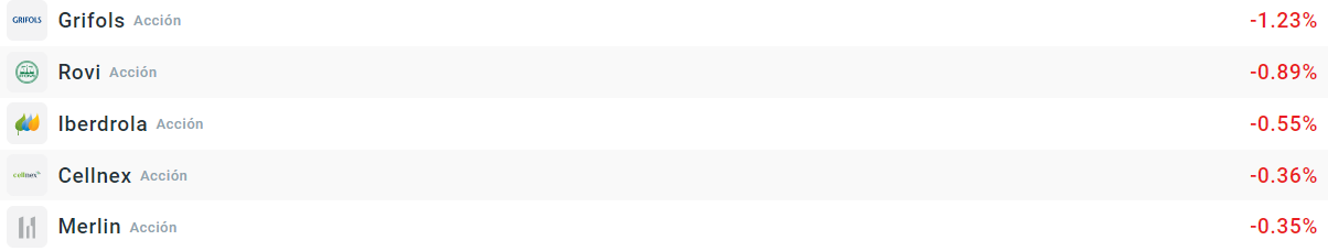 La parte bajista sigue protagonizada por Grifols, que está acusando la falta de nuevas noticias por parte de Brookfield. Rovi también cae y continúa la tendencia bajista que comenzó con su anuncio sobre la posible venta de su división de fabricación para terceros.