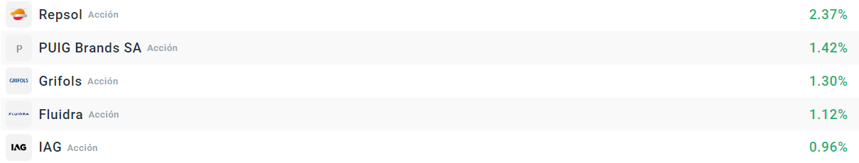 Repsol destaca en las subidas, rebotando en medio de una tendencia bajista debido a las caídas de los precios del petróleo. Además, diferentes casas de análisis han rebajado su precio objetivo, por lo que la situación es complicada para Repsol. Puig sube impulsada aún por los anuncios de estímulos de China y el rebote del sector del lujo.