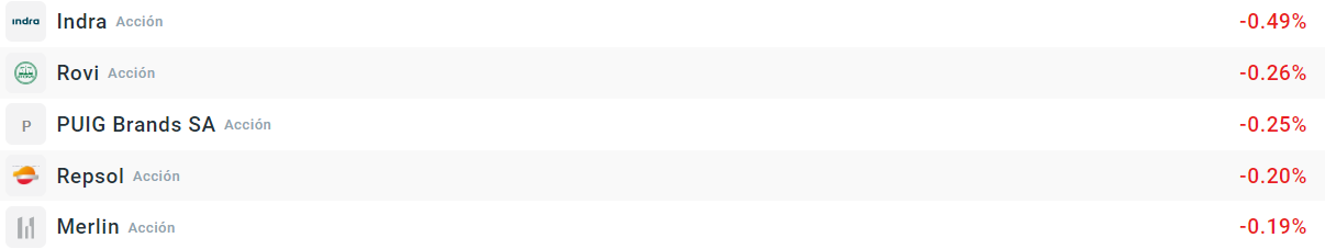 En la parte bajista vemos a Indra, de la que hemos conocido que Fidelity ha reducido su porcentaje de acciones hasta un mínimo del 0,784% desde el 3,407% máximo que llegó a poseer. Rovi y Puig también se ven arrastradas a la baja.