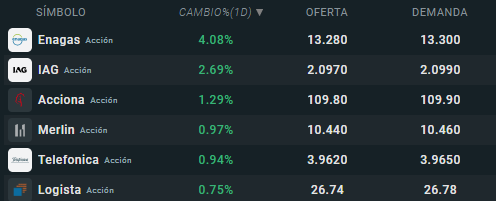 IAG (2,69%) y Enagás (4,08%) lideran las subidas del IBEX35. En el caso de la gasista viene motivado por el acuerdo alcanzado para vender su participación del 30,2% en la americana Tallgrass Energy al fondo Blackstone Infraestructure Partners, por un importe de 1.100 millones de dólares. La operación generará una minusvalía contable de 360 millones, tal y como han comunicado a la CNMV.