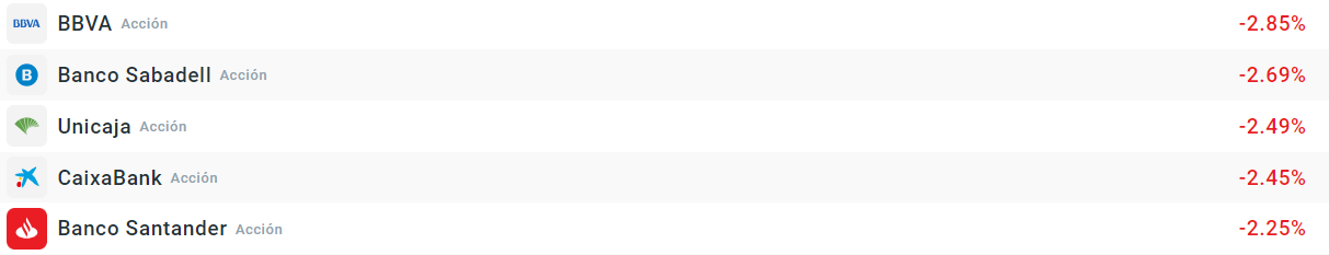 Por la parte bajista, la banca está sufriendo una profunda caída y ninguna entidad cae menos de un 2%, con BBVA y Sabadell como las que peor se comportan. Esto se debe a las expectativas de recortes de tipos para hacer frente a una posible ralentización de la economía, aunque también se puede achacar a los miedos de que al igual que en Estados Unidos, la tasa de morosidad ligada al consumo suba.