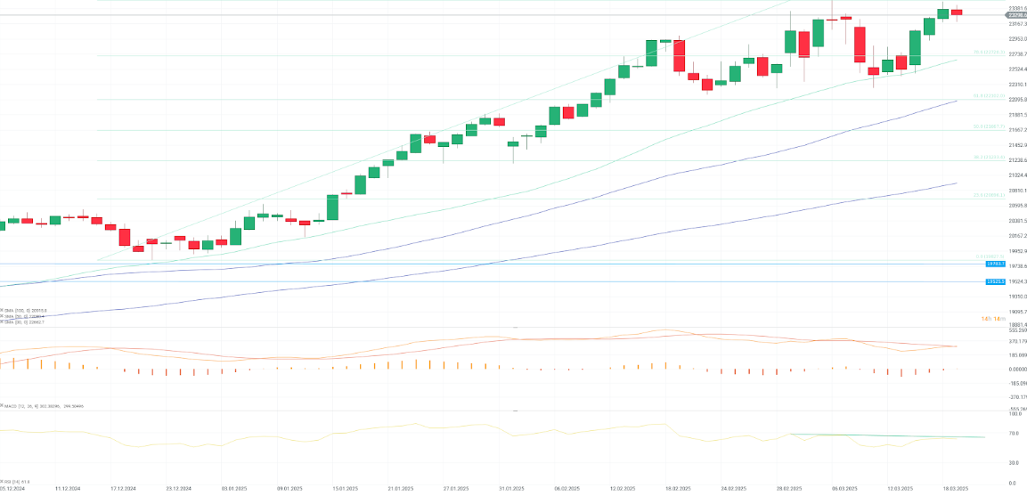 El Dax 40 intenta volver a máximos mientras los bajistas buscan descender del nivel de retroceso de Fibonacci del 78,6% y probar la media móvil simple (SMA) de 30 días en los 22.663 puntos. El RSI sigue sin poder romper la divergencia bajista iniciada el mes pasado, ya que aún no se ha formado un máximo superior a la línea de tendencia. Mientras tanto, el MACD se mantiene ajustado tras un cruce alcista.