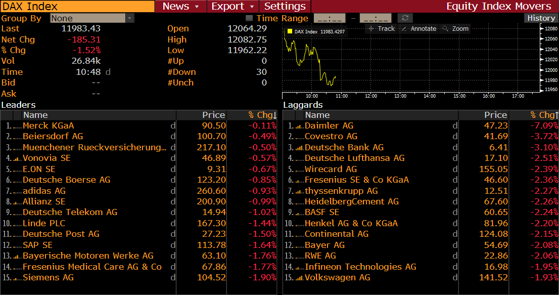 Daimler (DAI.DE) lidera las pérdidas en el DE30 a principios de la jornada del jueves. Fuente: Bloomberg