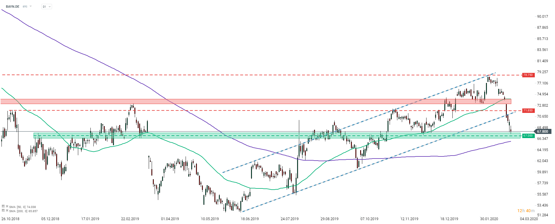 Bayer (BAYN.DE) cayó por debajo del límite inferior del canal ascendente a principios de esta semana. Las acciones están experimentando el mayor retroceso del actual impulso alcista. Los toros intentan detener el descenso en el nivel de soporte de 67 euros. La resistencia más cercana se encuentra en 71,85 euros, el límite inferior del canal ascendente. Fuente: xStation5