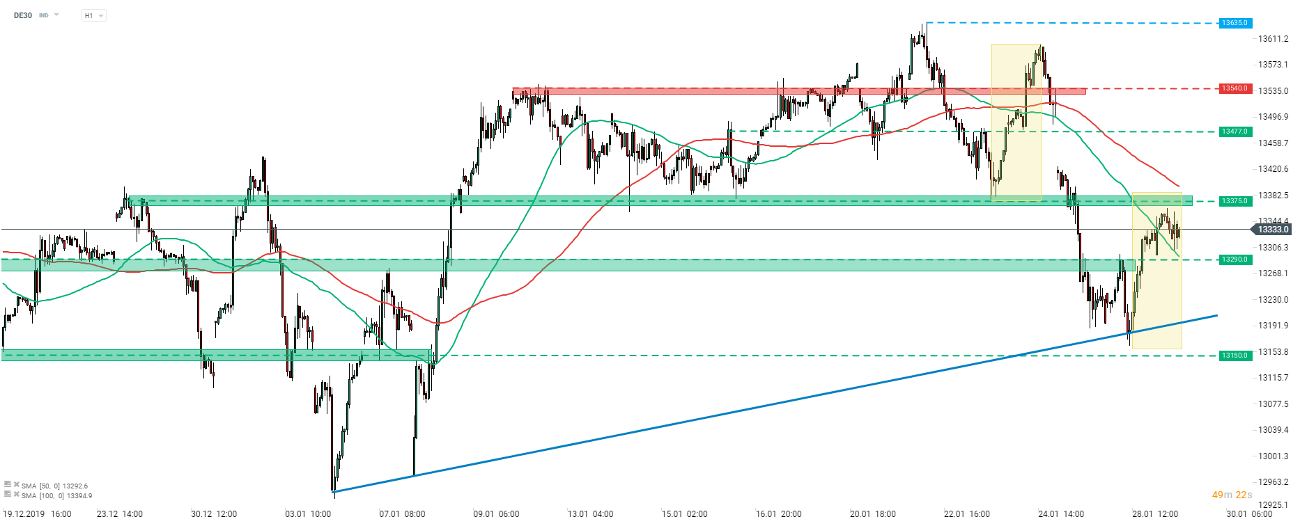 El DAX alemán detuvo el movimiento descendente en la línea de tendencia ascendente y saltó de nuevo por encima de 13300 pts después. Sin embargo, la recuperación se detuvo en la zona de apoyo que se extiende alrededor de 13375 pts. El índice parece que está pintando un nuevo máximo más bajo, amenazando con volver a los descensos pronto. En tal escenario, los operadores deberían centrarse en la zona de soporte de 13290 pts, donde también se puede encontrar un promedio móvil de 50 horas. La mencionada zona de resistencia es el primer nivel que hay que vigilar para los compradores. El límite superior de la estructura de “Overbalance” puede encontrarse en 13390 pts y una ruptura por encima podría insinuar una inversión de la tendencia a corto plazo.