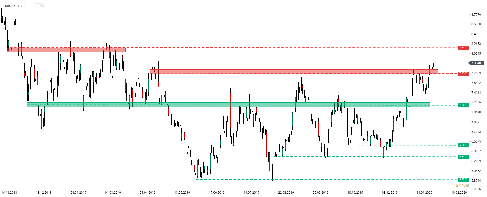 El Deutsche Bank (DBK.DE) finalmente logró superar la zona de resistencia que se encuentra cerca del mango de 7,75 euros. La acción está cotizando al nivel más alto desde abril de 2019. La resistencia más cercana a mirar se encuentra en 8,20 euros. El Deutsche Bank publicará mañana las ganancias de 2019. Fuente: xStation5