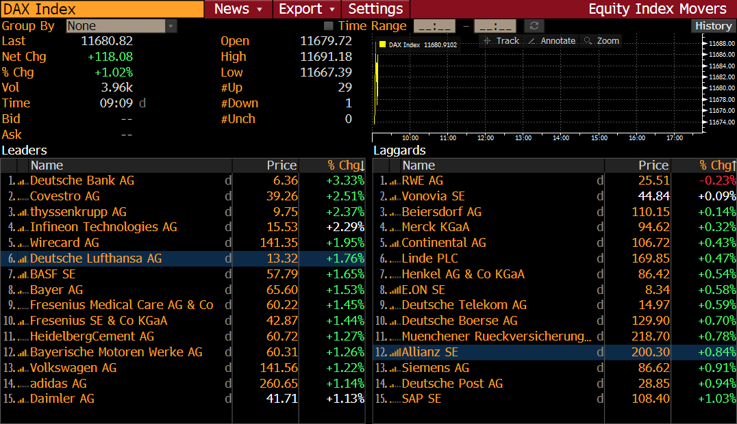 Las compañías del DAX en el arranque de la sesión europea. Fuente: Bloomberg