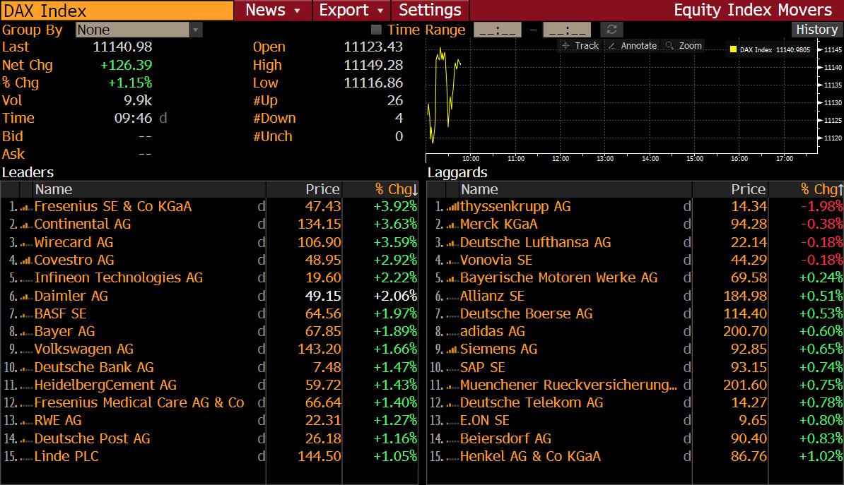 Thyssenkrupp (TKA.DE) es la empresa líder en DAX con peor rendimiento en el dia de hoy. La compañía ha anunciado hoy sus resultados para el cuarto trimestre de 2018. Thyssenkrupp consiguió unos ingresos superiores a los previstos de 7.942 millones de euros, alrededor de un 4% por encima de la media estimada. Por otro lado, la compañía ha obtenido una BPA de sólo 0,11 euros frente a los 0,21 euros previstos. Thyssenkrupp culpó a las tarifas de EE.UU., así como a la presión de los costes en China, como los principales factores que contribuyen a este mediocre rendimiento. Los resultados negativos de Thyssenkrupp ponen de manifiesto la debilidad del sector manufacturero alemán, que se ha visto acentuada recientemente por los datos de la economía más importante de Europa.