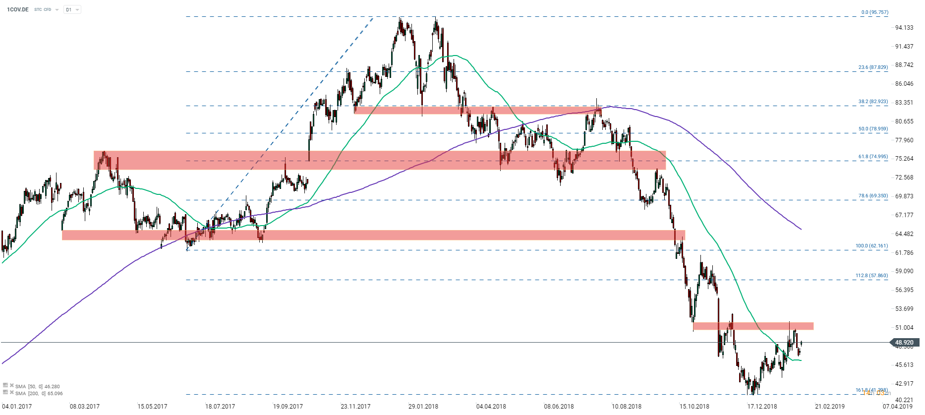 Covestro (1COV.DE)ha tenido un mal desempeño desde que pintara el patrón de doble techo a finales 2017 inicios de 2018. La acción logró detener la caída en el nivel 161,8%de fibonacci del impulso ascendente iniciado en julio de 2017. La zona de resistencia que oscila entre los 51 y 52 dólares puede considerarse como el primer obstáculo importante para los alcistas en su marcha ascendente. Fuente: xStation5