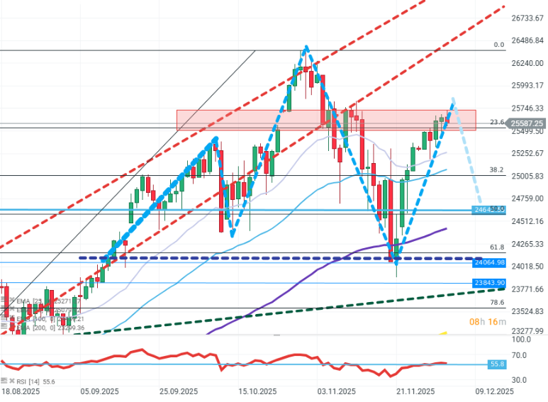 El Nasdaq 100 se encuentra expectante ante la próxima semana, en la que recibirá una actualización de la Fed sobre los tipos de interés. Actualmente, el mercado espera un recorte de 25 puntos básicos con una probabilidad cercana al 90%. El Nasdaq 100 corrige dos décimas hasta los 23.405 puntos