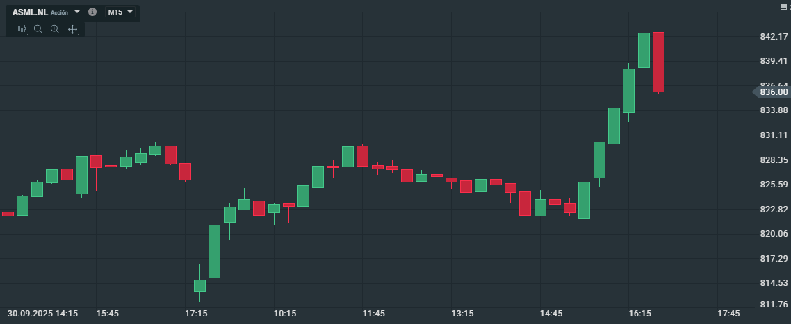 ASML cotiza en los 836 euros por título, a un 17% de máximos históricos.