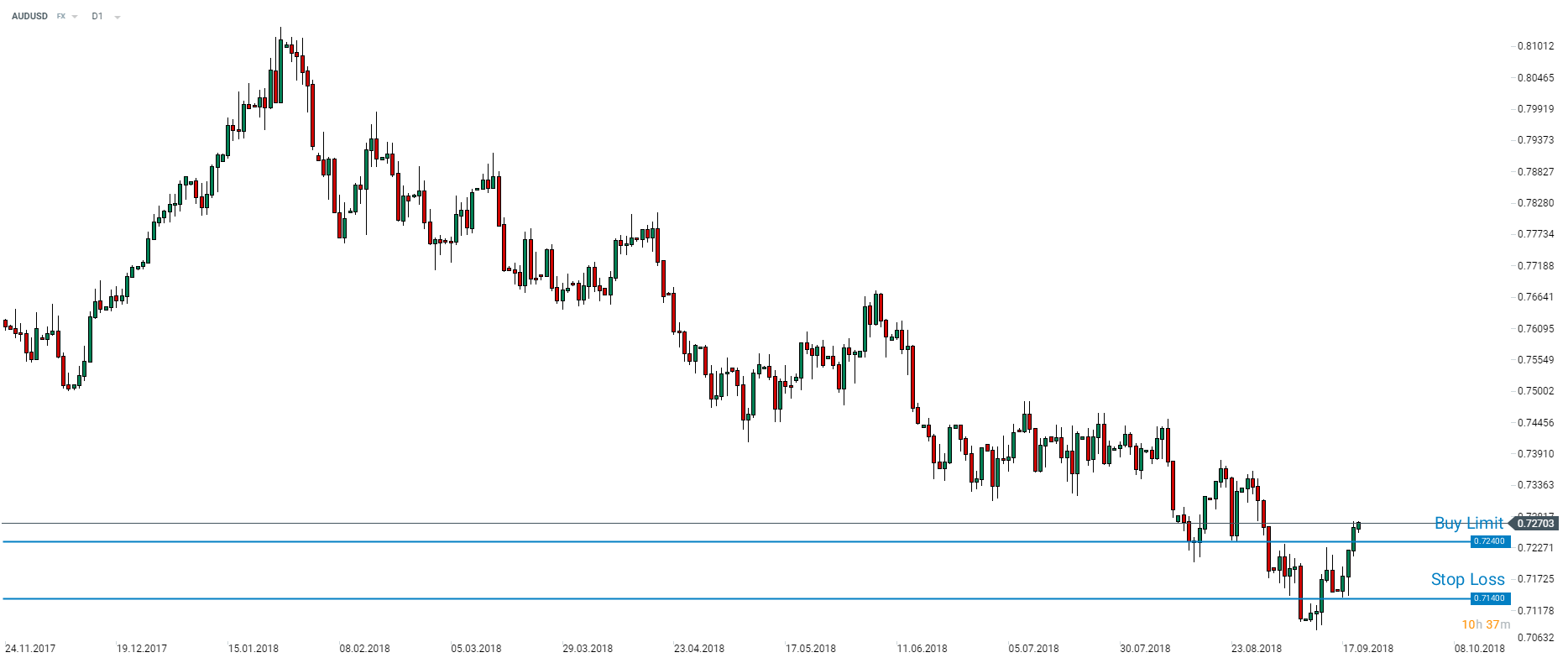 Thomson Reuters IFR recomienda posicionarse largo en AUDUSD con una orden limite en 0.7240 y un stop en 0.7140. No se ha especificado el objetivo de esta operación. Fuente: xStation5