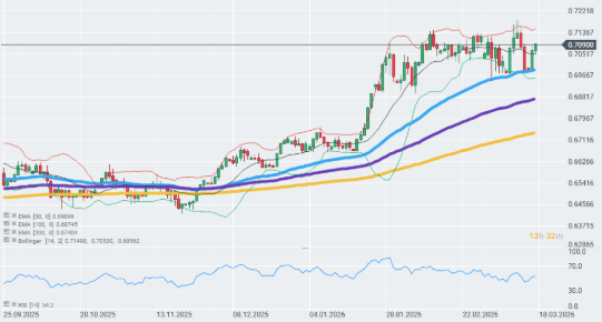 Técnicamente, el par AUD/USD ha mantenido un soporte clave alrededor de 0,7040 (la EMA de 50 días), cuya ruptura podría abrir la puerta a nuevas caídas hacia 0,7000. Sin embargo, mientras persistan las expectativas de más subidas en Australia, el par sigue apoyado por la demanda asociada a flujos de capital en busca de mayores rendimientos y por la mencionada media móvil de 50 días.