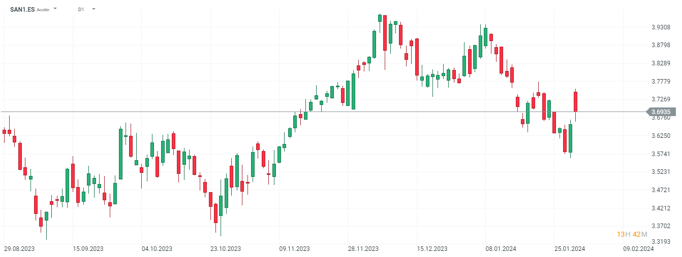 Las acciones de Santander siguen cayendo más de un 4% en lo que llevamos de 2024, a pesar de la subida de hoy.