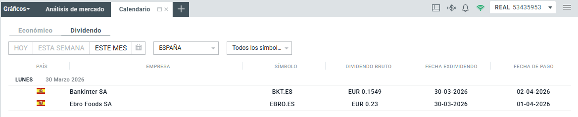 Los clientes que operan con XTB pueden consultar en cualquier momento el calendario completo de dividendos directamente desde la plataforma xStation 5, donde encontrarán las fechas de ex‑date, pago y los importes actualizados para cada compañía. Esta sección está disponible también en la web de XTB, facilitando el seguimiento centralizado de todas las retribuciones previstas del mes.