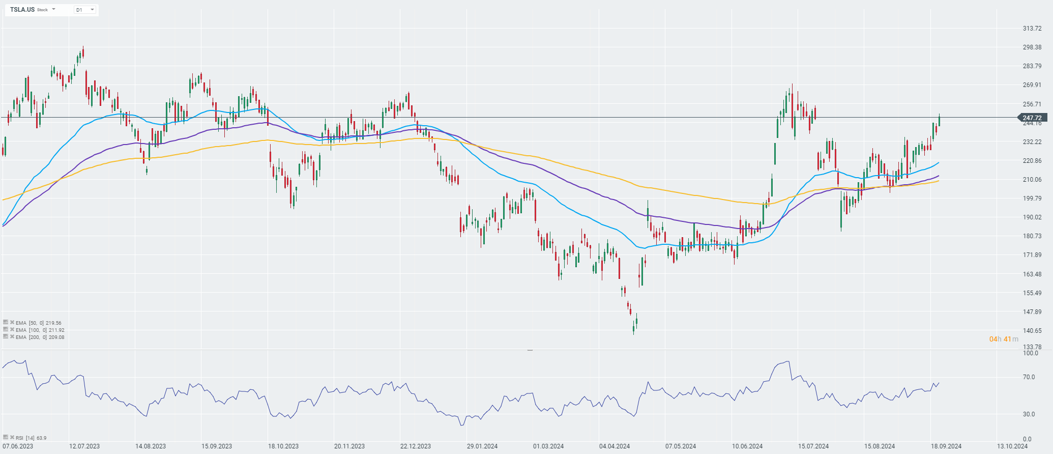 Tesla se encuentra actualmente en un patrón de tendencia alcista, como lo demuestran los promedios móviles exponenciales inclinados hacia arriba.