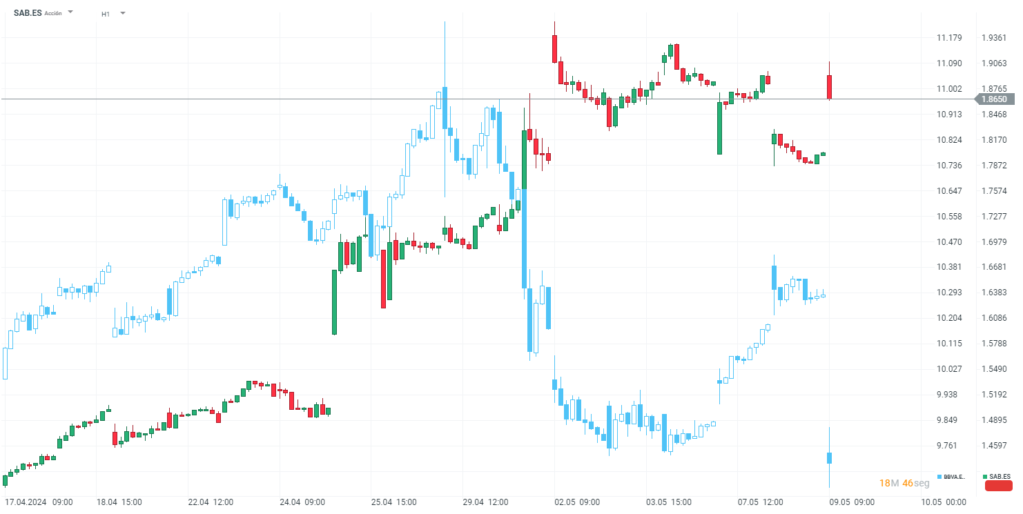 Las acciones de BBVA (velas blancas y azules) caen tras la noticia, mientras que las de Sabadell (velas verdes y rojas) suben con fuerza.