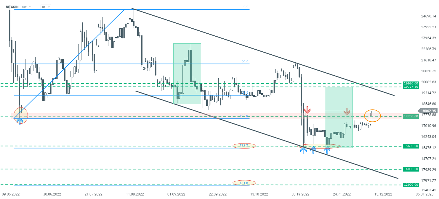 Echando un vistazo a BITCOIN en el intervalo D1, podemos ver que el precio superó una importante zona de resistencia en el área de $ 17,700 y continuó subiendo más adelante. Si la vela diaria de hoy se cerrara al nivel actual o superior, la perspectiva técnica para los alcistas mejoraría y BITCOIN podría apuntar a la próxima resistencia importante: el límite superior de la geometría del mercado en el área de $19,777-19,990. Por otro lado, el hecho de no mantener las ganancias y un retroceso por debajo de la zona de precios de $ 17,700 antes mencionada podría indicar que la tendencia bajista todavía está en juego y que las caídas pueden reanudarse.
