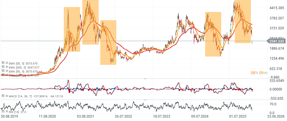 La situación para Ethereum es aún más drástica, ya que la corrección desde los máximos se acerca actualmente al 55%. Si bien es probable un repunte técnico dada la magnitud de las caídas, una reversión de tendencia duradera es menos realista mientras Bitcoin se mantenga bajo presión. Al igual que Strategy en el caso de Bitcoin, Ethereum también tiene su propia "Estrategia" en forma de Bit Immersion Digital. La compañía dirigida por Tom Lee acumula actualmente más de 5.000 millones de dólares en pérdidas no realizadas en sus tenencias de ETH. Si bien los fundamentos a largo plazo que respaldan la creciente importancia de Ethereum como red que se beneficia de la megatendencia de la tokenización se mantienen intactos, los flujos de capital se mantienen cautelosos, y no hay indicios de que los compradores tengan la fuerza suficiente para impulsar ETH por encima de los 3000-3300 dólares a corto plazo, especialmente si Bitcoin continúa alimentando la incertidumbre en el mercado.