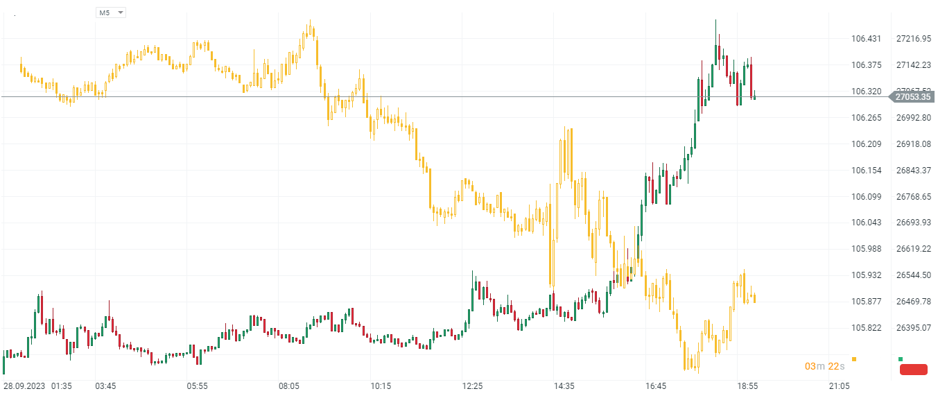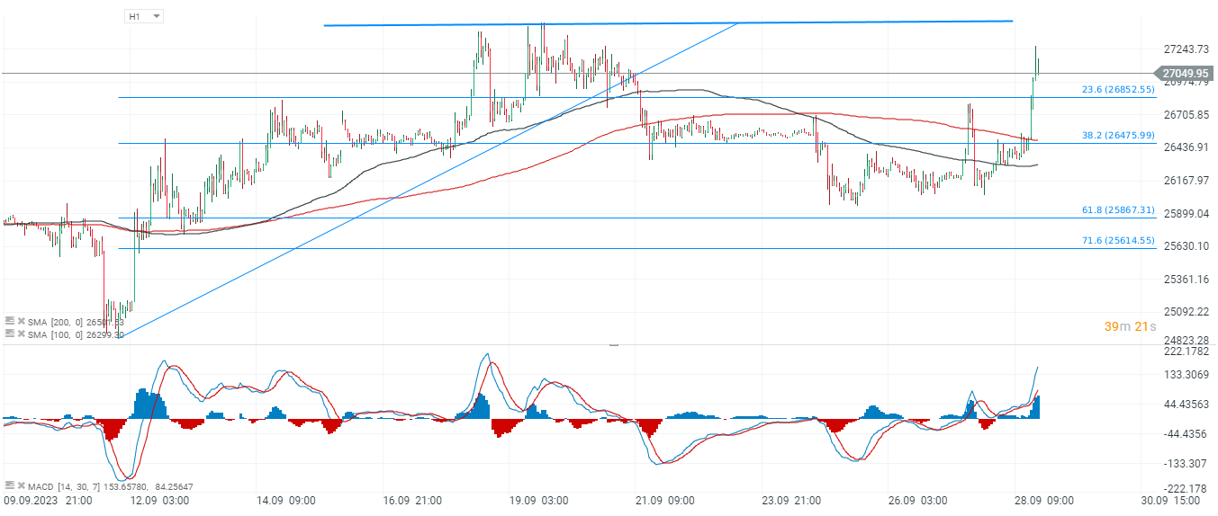 BITCOIN está registrando un crecimiento después de un período de tendencia lateral prolongada. Finalmente ha logrado superar el nivel de retroceso de Fibonacci del 23.6% de la onda alcista del 11 de septiembre, y ahora una prueba de los máximos de septiembre por encima de los $27,500 parece ser el escenario más probable. Fuente: xStation5.
