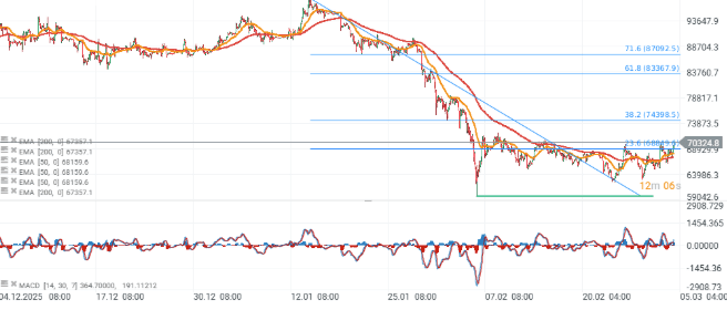 Bitcoin reanuda su rally, incluso aunque el sentimiento en los mercados bursátiles globales sigue indicando aversión al riesgo, visible incluso en la caída de los metales preciosos, especialmente la plata. Existe la posibilidad de que parte del capital que abandona el mercado de la plata esté rotando hacia un bitcoin sorprendentemente resistente. Desde el ataque estadounidense a Irán, el precio de la criptomoneda ha subido alrededor de un 10%, después de caer inicialmente hasta unos 63.000 USD en la reacción inmediata.