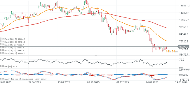 Bitcoin cotiza actualmente cerca del límite superior de su canal de consolidación tras las recientes caídas. La principal prueba de fuerza podría aparecer si el precio se dirige hacia la zona de 76.000 dólares, donde se encuentra la EMA50. Este nivel ha actuado repetidamente como una zona de resistencia significativa desde otoño —especialmente a principios de octubre de 2025 y mediados de enero de 2026—.