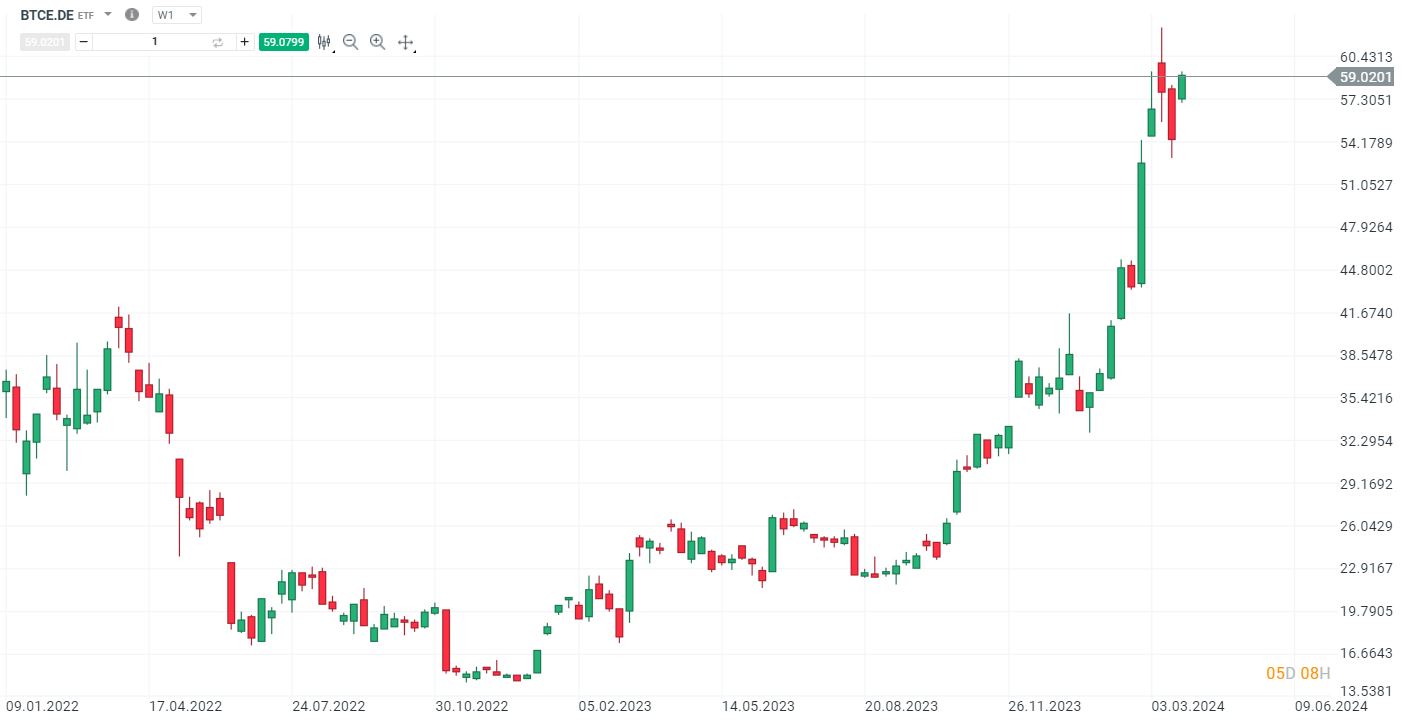 Aquí podemos observar como en el ETF sobre Bitcoin también se desarrolla este movimiento al alza. Bitcoin ha conseguido recuperar la senda alcista en el comienzo de la semana y ya roza la barrera de los 70.000 dólares, donde en este ETF se situaría sobre los 60€.