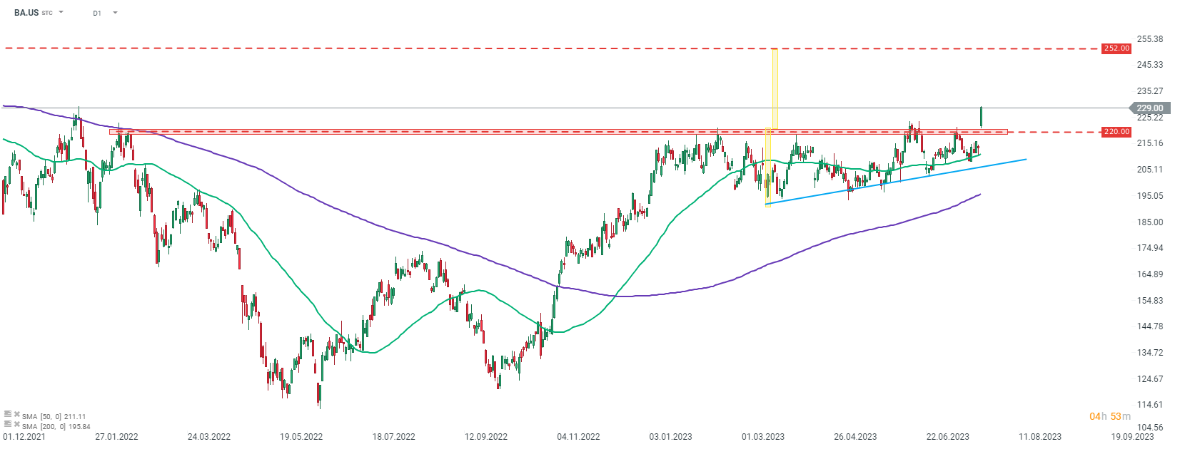 Boeing (BA.US) se disparó después del informe de resultados. La acción inició el día con un gap alcista de más del 3% y continuó subiendo posteriormente. Al observar el gráfico diario desde un punto de vista técnico, podemos ver que la acción rompió por encima de la zona de resistencia de $220, que también sirvió como límite superior de un patrón de triángulo ascendente. La proyección teórica del desglose apunta a un área de $252, que es un nivel no visto desde mediados de 2021. Fuente: xStation5.