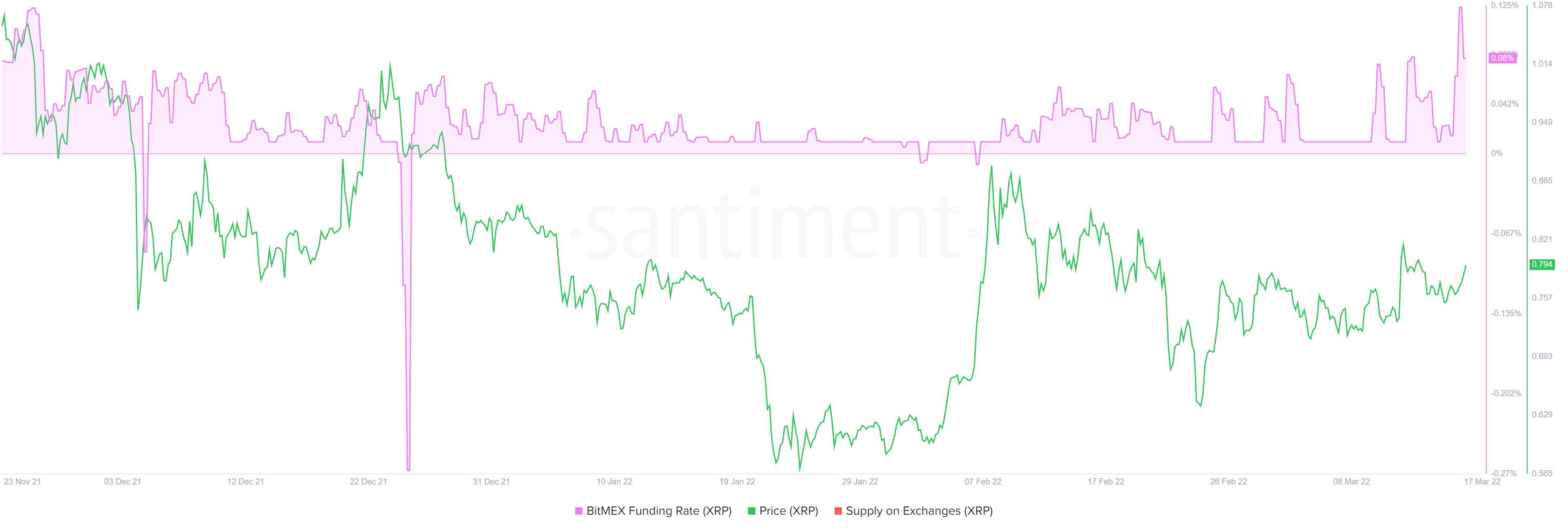La tasa de financiación de Ripple aumentó significativamente en los últimos días. Fuente: Sentimiento