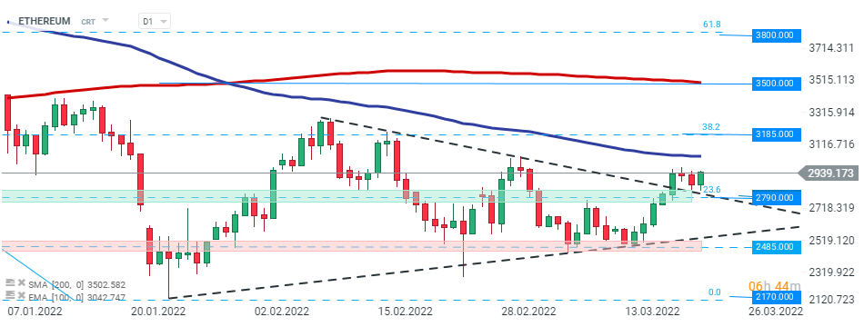 Ethereum logró superar la principal zona de resistencia alrededor de $ 2790,00, que está marcada con el límite inferior de la formación del triángulo y el 23,6% de retroceso de Fibonacci de la última corrección a la baja. Hoy, el precio volvió a probar esta área, después de lo cual se reanudó el movimiento alcista. El próximo objetivo para los compradores se ubica en $3185 y coincide con el retroceso de Fibonacci del 38,2% de la última corrección a la baja. Fuente: xStation5