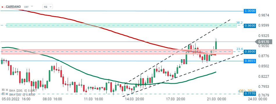 El precio de Cardano se está recuperando de una caída reciente debido al creciente dominio en el ecosistema DeFi. Hoy, el precio superó la resistencia principal en $0,89, lo que coincide con el retroceso de Fibonacci del 23,6 % de la última corrección a la baja y la media simple de 200 (línea roja). Fuente: xStation5