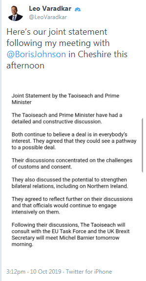 La declaración conjunta entre Boris Johnson y su homólogo irlandés Leo Varadkar ha impulsado a la libra. En el mensaje de Twitter se publicaba lo siguiente:
