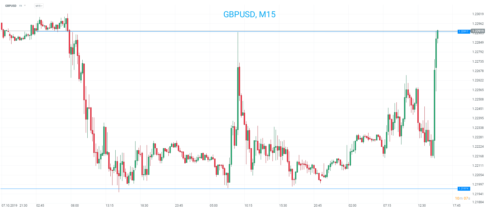 El GBPUSD se ha disparado de nuevo por las noticias aparentemente positivas sobre el Brexit. El precio subió 80 pips para volver a negociarse cerca de los $ 1.23. Fuente: xStation