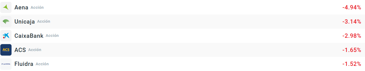 La parte baja del Ibex 35 está copada por las acciones de Aena, que caen un 5% por el descuento del dividendo. Lo mismo ocurre con Unicaja o CaixaBank, que también están ocupando la parte baja. En el caso de Fluidra o ACS ya sí hablamos de caídas naturales del mercado y la incertidumbre que estamos viviendo. Sin embargo, hay que señalar que la tabla del Ibex 35 está actualmente dividida a la mitad, por lo que no sería de extrañar que vieramos un cambio de rumbo a lo largo de la sesión.