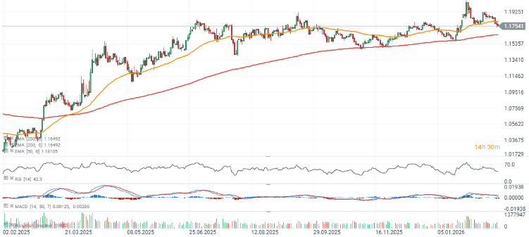 El EUR/USD amplía su caída hoy, con la EMA 200 —que define la tendencia— situada cerca de 1,165. Este nivel ha actuado como soporte en tres ocasiones recientes: dos veces en noviembre de 2025 y una vez en enero de este año.