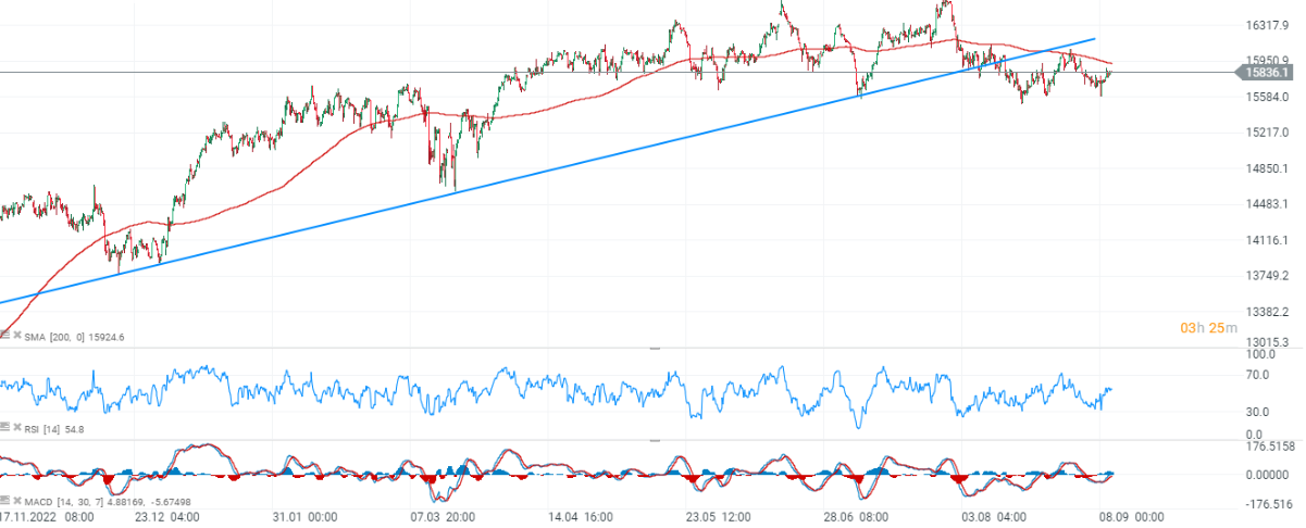 Si observamos el comportamiento del índice alemán vemos que, al igual que el par EUR&/USD, el índice ha roto la tendencia alcista desde abajo: la barrera clave para los bajistas se sitúa en torno a los 16.000 puntos. Fuente: xStation5