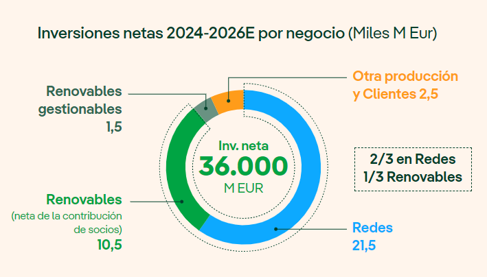 Iberdrola publicó recientemente su Plan Estratégico para el periodo 2024-2026, con unas inversiones netas de 36.000 millones de euros para mejorar su modelo de negocio. Este plan se focaliza sobre todo en su línea de negocio Redes, que se centra en la gestión y mantenimiento de la red eléctrica y el 70% del total se dedicará a capex de crecimiento.