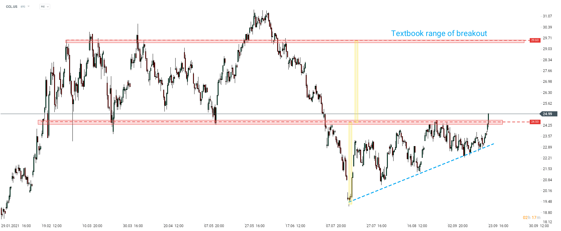 Echando un vistazo al gráfico de Carnival Corp (CCL.US), podemos ver que la acción ha logrado romper por encima de la zona de resistencia en 24,50 dólares, que ha servido como límite superior de un patrón de triángulo ascendente reciente. El rango de la ruptura al alza de este patrón apunta a una posibilidad de un movimiento alcista de alrededor del 18%, hasta el área de $ 29.60.
