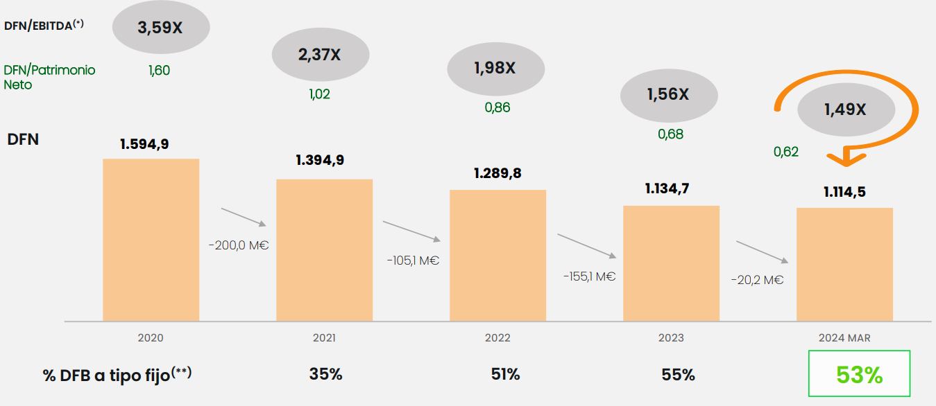 Por su parte, el endeudamiento de la compañía sigue mejorando considerablemente, ubicándose en 1,49 veces deuda neta/Ebitda. Esta evolución es muy reseñable en una industria donde hay ciclicidad, por lo que la posición financiera es importante para hacer frente a periodos más difíciles.