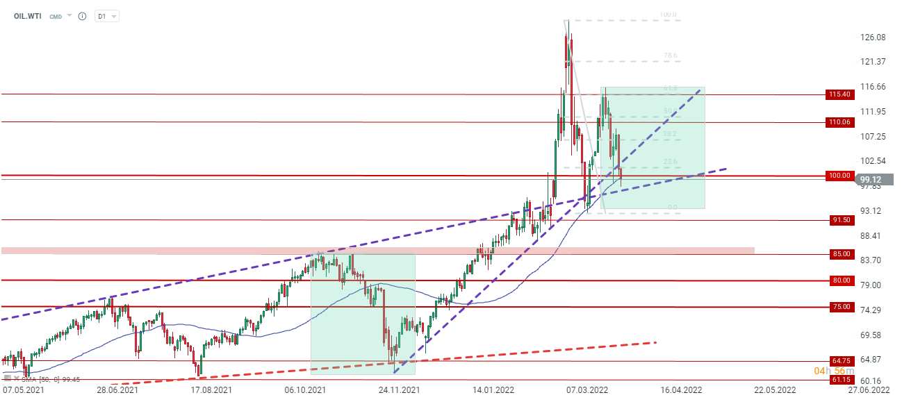 Vale la pena señalar que el otoño pasado tuvimos una gran caída en los precios del petróleo debido a la liberación de una gran cantidad de reservas de EE. UU. Ahora bien, este año también hemos tenido una liberación de algunas reservas, pero la clave estará en acciones futuras. Por lo tanto, un apoyo importante para los precios se ubica en la zona de los 94 USD por barril. Antes de eso, por supuesto, tenemos una línea de tendencia alcista, que resulta de la cuña en expansión, donde el precio reaccionó después de las caídas de la fase inicial de marzo. Además, también tenemos la media de 50 días, a la que el mercado también reaccionó a principios de marzo. En vista de esto, un cierre por debajo de la media móvil o incluso por debajo de la línea de tendencia alcista podría ser una señal negativa para el petróleo. Aun así, el riesgo de falta de suministro es considerable. Incluso antes de la guerra en Ucrania, se especulaba con un precio de más de 100 USD por barril. La acción de los Estados Unidos mitigará el impacto de la escasez, pero no la eliminará al 100%.