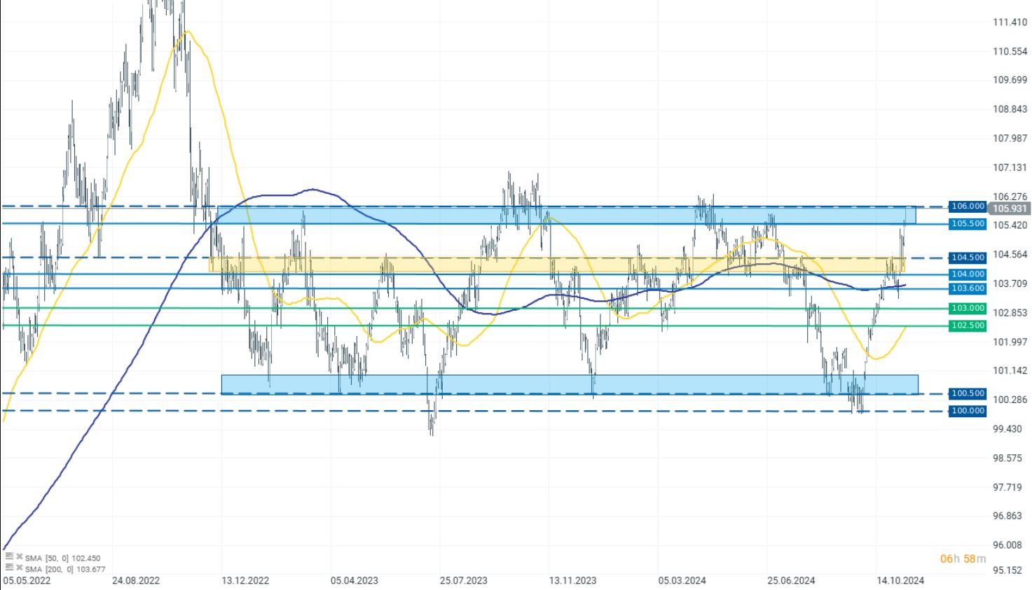 Desde una perspectiva de análisis técnico, el índice del dólar se está acercando al importante nivel de 106 puntos, que durante los últimos dos años de consolidación solo se ha probado brevemente.