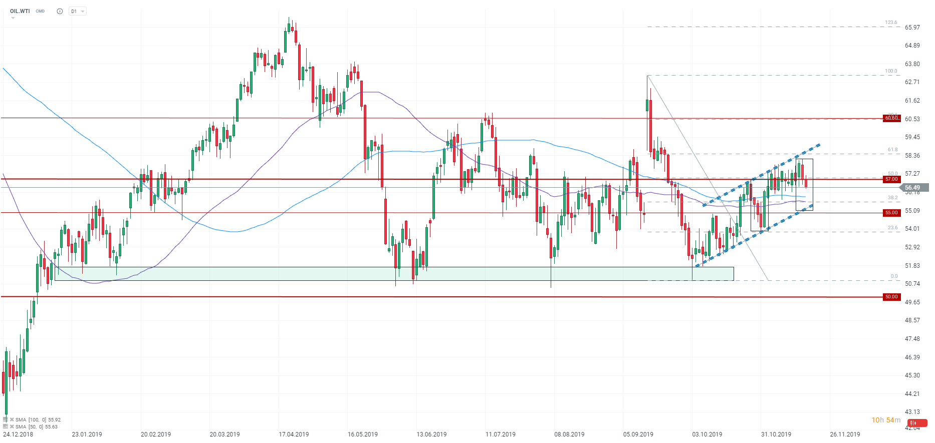 El petróleo brent está retrocediendo en medio de la falta de noticias sobre las relaciones chino-estadounidenses y noticias negativas sobre la demanda. El soporte más cercano se puede encontrar en la zona de $ 55-55.60, donde se puede encontrar el límite inferior de la estructura Overbalance, el nivel de Fibo del 38.2% y el límite inferior del canal ascendente. Fuente: xStation5