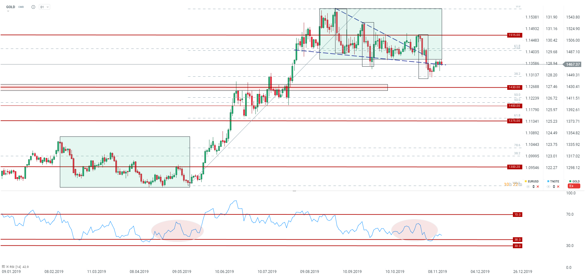 Los precios del oro se están moviendo lateralmente después de abandonar la consolidación. El oscilador RSI sugiere que podría haber un rebote sobre la mesa. Fuente: xStation5