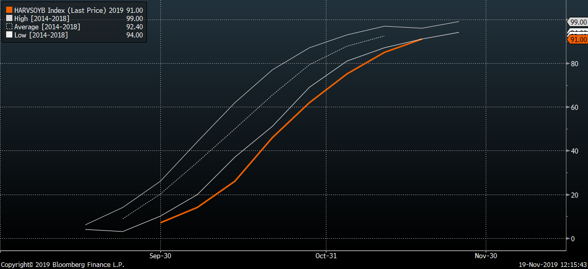 El progreso de la cosecha vuelve al rango de 5 años al final de la temporada. Sin embargo, no significa que la cosecha sea tan grande como se había previsto anteriormente. Fuente: Bloomberg