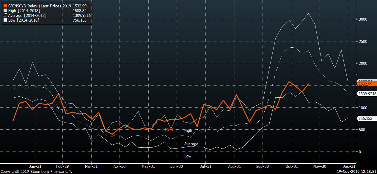 Las inspecciones de soja se recuperan del mínimo de 5 años. Sin embargo, los picos estacionales ya han quedado atrás. Fuente: Bloomberg