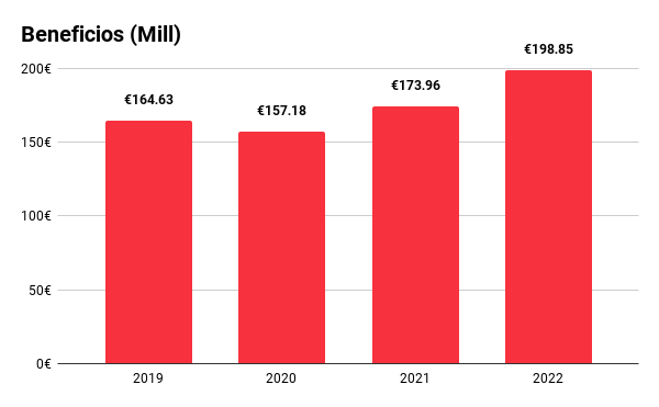 Sus crecimientos han sido bajos pero estables, con un aumento anual de los beneficios en el periodo 2019-2022 ligeramente superior al 6% de media. Sin embargo, en el 2023 experimentó un gran crecimiento como consecuencia del buen desempeño del negocio y de las adquisiciones realizadas, consiguiendo un aumento del 36,9% en su beneficio neto.