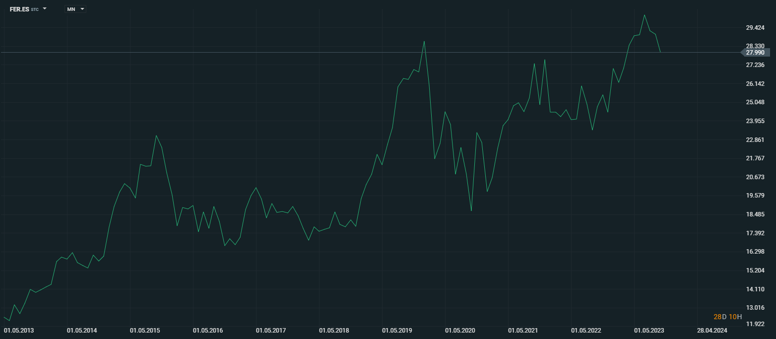 Ferrovial (FER.ES) es una empresa que se dedica a la construcción y gestión de infraestructuras, entre las que destacan las autovías de peaje, aeropuertos, obras civiles, infraestructuras energéticas y movilidad. Destaca por su papel internacional, que le proporciona la mayoría de sus ingresos y donde destaca Estados Unidos. Además, recientemente cambio su sede social a Países Bajos.