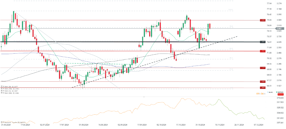 La negociación de Trump significa un dólar más fuerte y mayores rendimientos, lo que podría perjudicar al lingote en el corto plazo. El oro está registrando actualmente su mayor corrección del año, alcanzando ya aproximadamente los 200 dólares por onza. Sin embargo, la zona entre 2.550 y 2.600 es muy fuerte, observando las aboliciones de 38,2 y 50,0 de la onda ascendente de la segunda mitad del año, la línea de tendencia ascendente dibujada después de los mínimos de este año y la media móvil de 100 períodos.