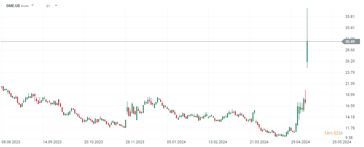 Ayer tuvimos grandes subidas por parte de algunas "meme stocks" o "acciones meme" en el mercado americano, pero sin duda la que más destacó fue GameStop (GME.US). Las acciones de la empresa terminaron con una subida de casi el 80% y todo se debió a que Roaring Kitty, el famoso inversor que ganó millones en marzo de 2021, comenzó a twittear.